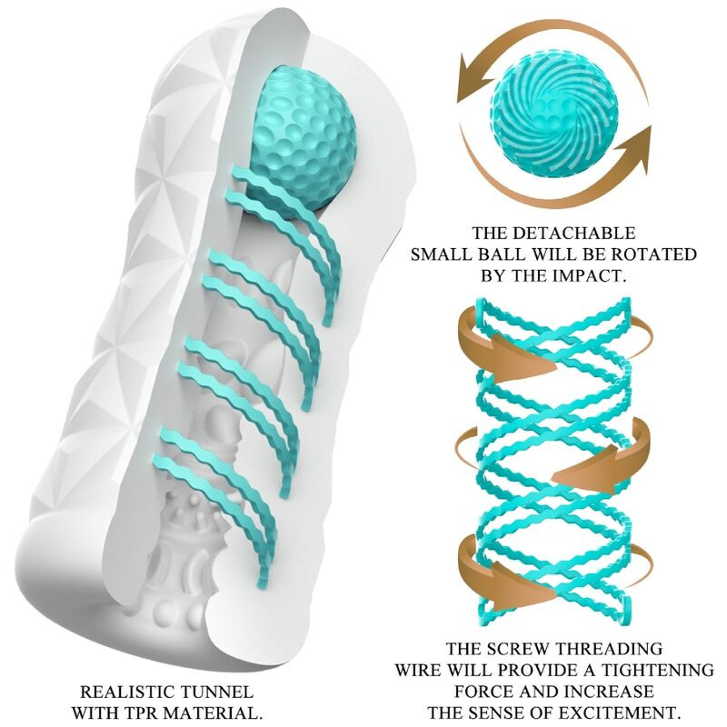 Kis eszköz hatalmas maszturbációs szórakozáshoz! Ez az átlátszó és újrahasználható maszturbátor forgó spirálral és oldalán egy stimulációs gömböt tartalmaz, a forgó spirál forgatja a maszturbátort behatolás közben, a felső golyó pedig a megfelelő pontot stimulálhatja és új érzést adhat. A hüvelynek belül stimuláló és izgalmas textúrája van, amely intenzíven és dinamikusan masszírozza a péniszt kézi munka közben. Ezt a stílusos, bőrbarát maszturbátort újra és újra használhatod. Nagyon könnyű használni és tiszta öröm!