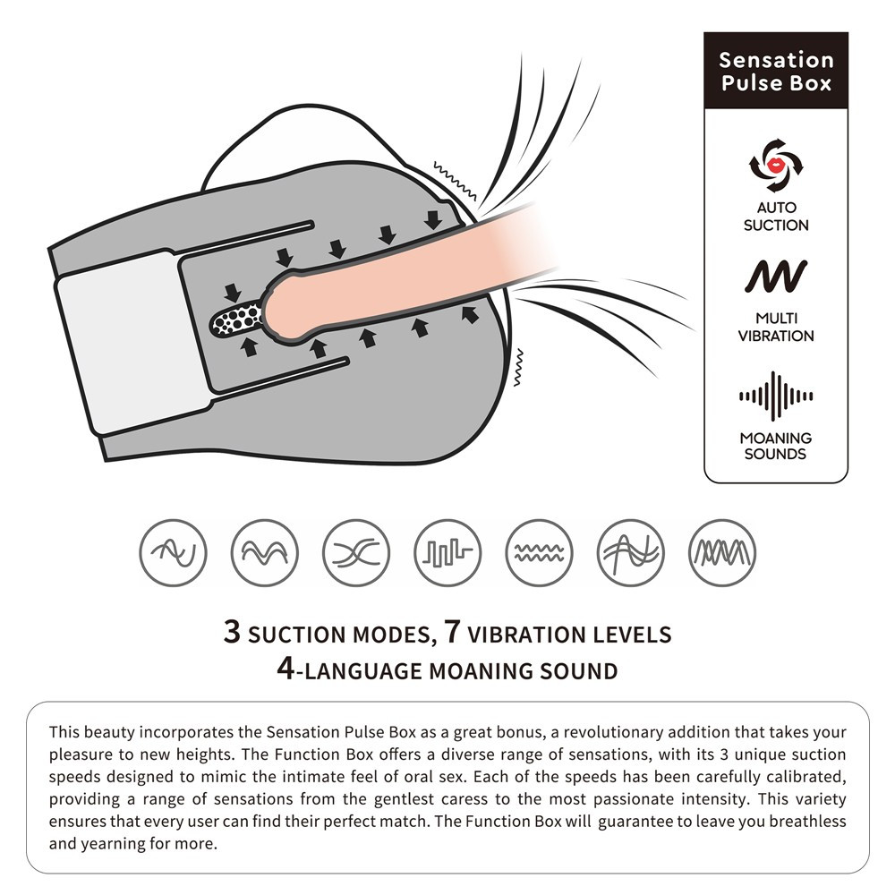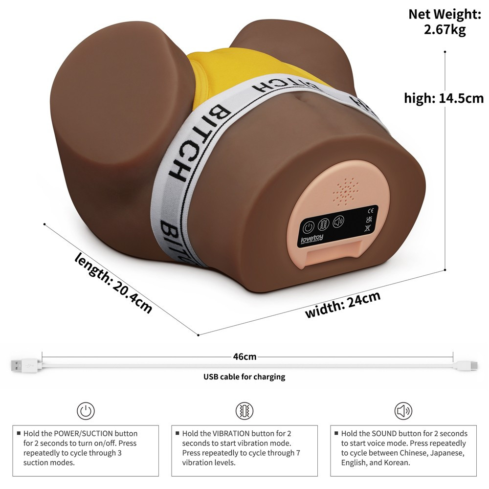 Gefertigt aus hochwertigem, lederähnlichem Material für Männer Mit empfohlenen, realistisch gestalteten Anus- und Vaginalöffnungen Entworfen mit 3 Saug- und 7 Vibrationsfunktionen, erotisch beim Geschlechtsverkehr Masturbator, der Geräusche macht. Selbstkontrolle beim Geschlechtsverkehr nutzen Sie kann stark verbessert werden, sodass ihre Zeit deutlich verlängert werden kann. Das Paket Es beinhaltet außerdem einen Frauenstring. Englisch, Japanisch, Koreanisch und Chinesisch als Audio . Produktgewicht 2,67 kg.