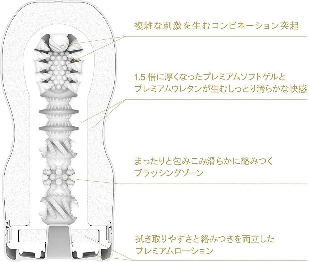 A TENGA híres CUP sorozatának prémium változatai az eredetinél 1,5x vastagabb belső elasztomerhüvellyel rendelkeznek.